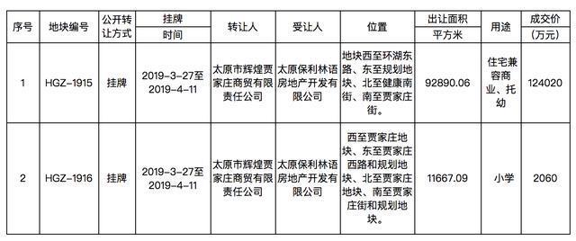 2宗地块全部由太原保利林语房地产开发有限公司拿下,预计为保利西湖林语北区住宅项目和配套小学。