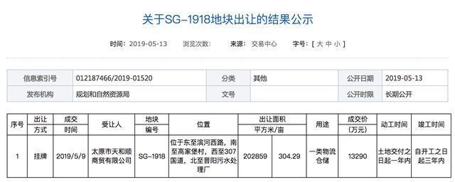 该宗土地位于东至滨河西路,南至高家堡村,西至307国道,北至晋阳污水处理厂,出让面积202859平方米,土地用途一类物流仓储,总成交价13290万元,溢价率3.9%,由太原市天和顺商贸有限公司拿下。